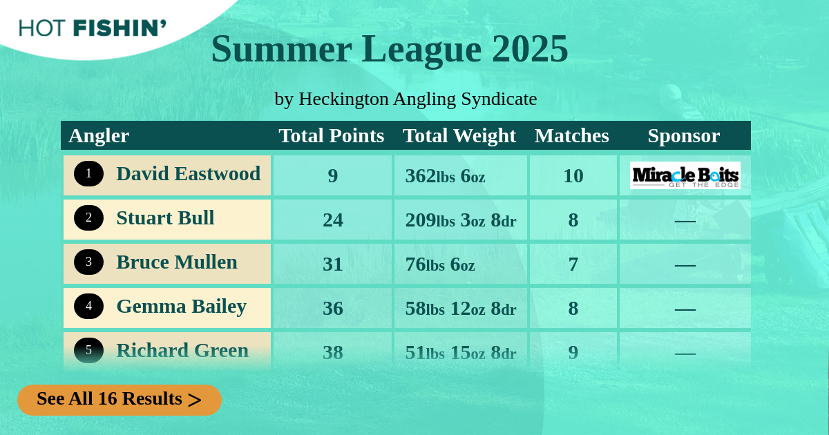 | Angler | Total Points | Total Weight | Matches | 23/03/2025 | 06/04/2025 | 20/04/2025 | 18/05/2025 | 01/06/2025 | 13/07/2025 | 10/08/2025 | 24/08/2025 | 07/09/2025 | 21/09/2025 | Sponsor |