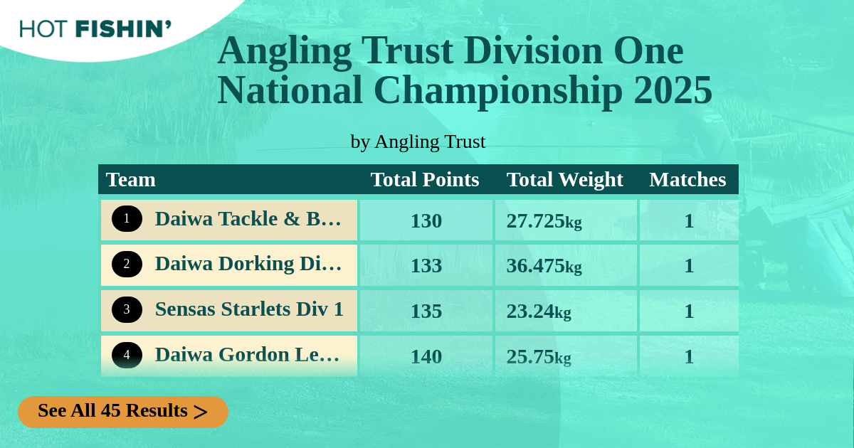 2 Daiwa Dorking Div 1 | 133 | 36.475kg80lbs 6oz 9dr | 1 | 13336.475kg80lbs 6oz 10dr |