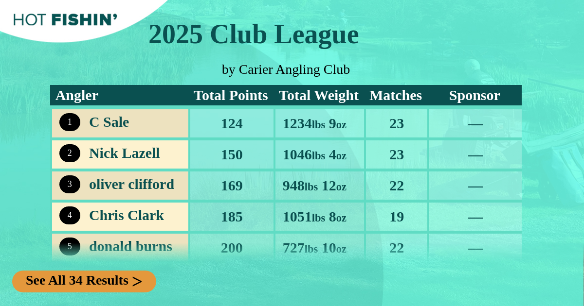 | Angler | Total Points | Total Weight | Matches | 05/01/2025 | 19/01/2025 | 02/02/2025 | 16/02/2025 | 02/03/2025 | 16/03/2025 | 30/03/2025 | 13/04/2025 | 27/04/2025 | 11/05/2025 | 25/05/2025 | 08/06/2025 | 22/06/2025 | 06/07/2025 | 20/07/2025 | 03/08/2025 | 17/08/2025 | 31/08/2025 | 14/09/2025 | 28/09/2025 | 12/10/2025 | 26/10/2025 | 09/11/2025 | 23/11/2025 | Sponsor |
