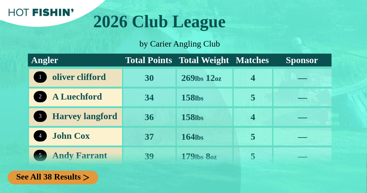 | Angler | Total Points | Total Weight | Matches | 25/01/2026 | 08/02/2026 | 02/03/2026 | 03/03/2026 | 22/03/2026 | Sponsor |