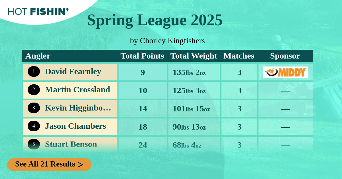 | Angler | Total Points | Total Weight | Matches | 06/04/2025 | 27/04/2025 | 04/05/2025 | Sponsor |