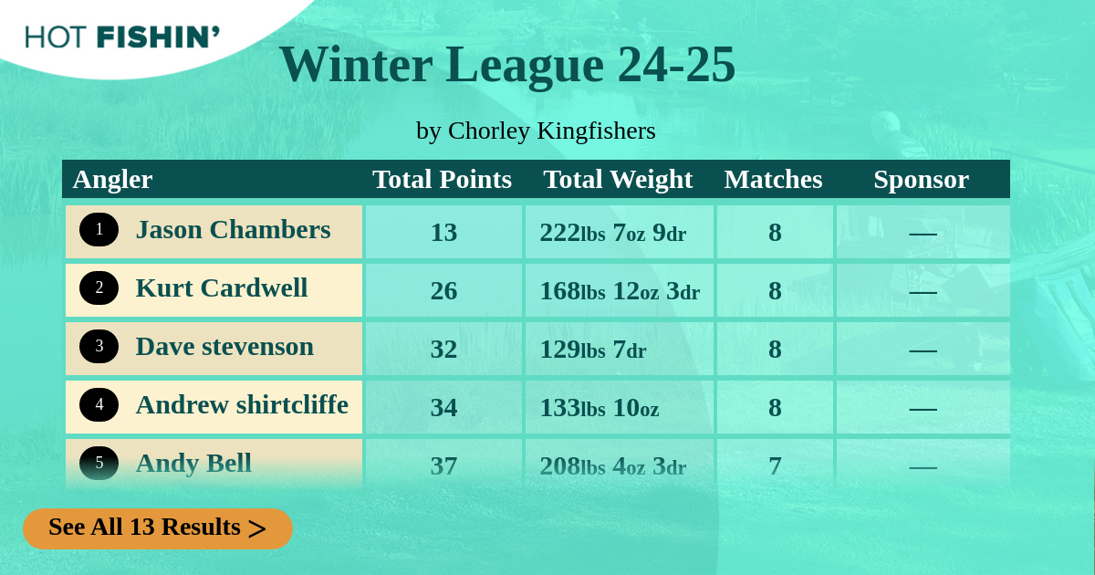 | Angler | Total Points | Total Weight | Matches | 03/11/2024 | 17/11/2024 | 01/12/2024 | 19/01/2025 | 02/02/2025 | 16/02/2025 | 02/03/2025 | 23/03/2025 | Sponsor |