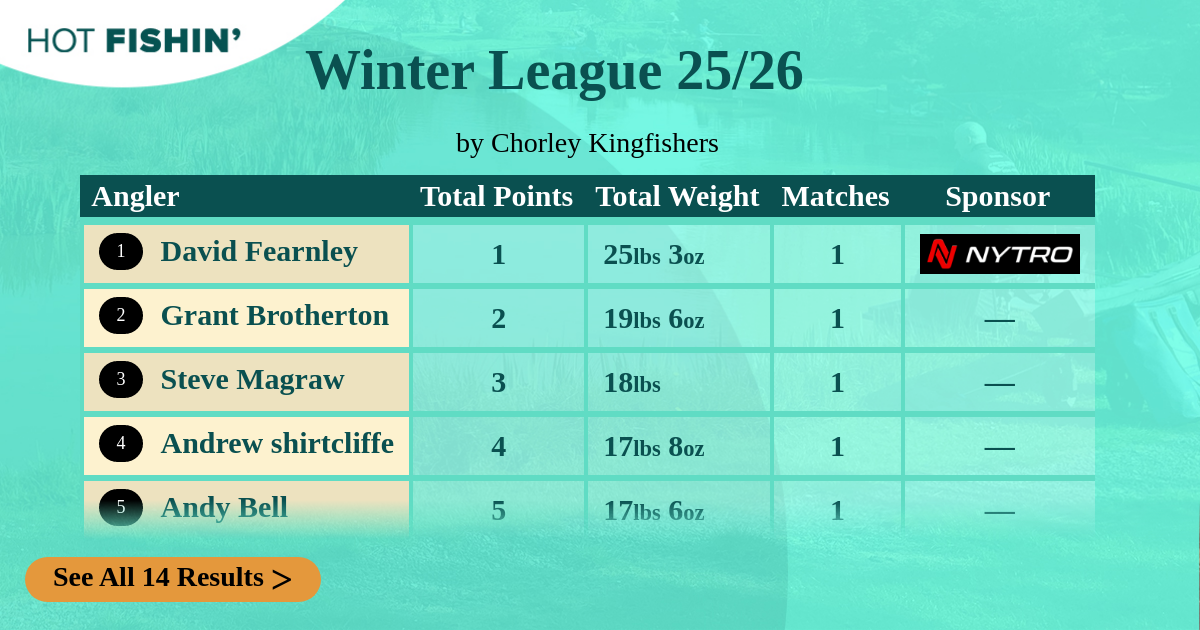 | Angler | Total Points | Total Weight | Matches | 30/11/2025 | Sponsor |