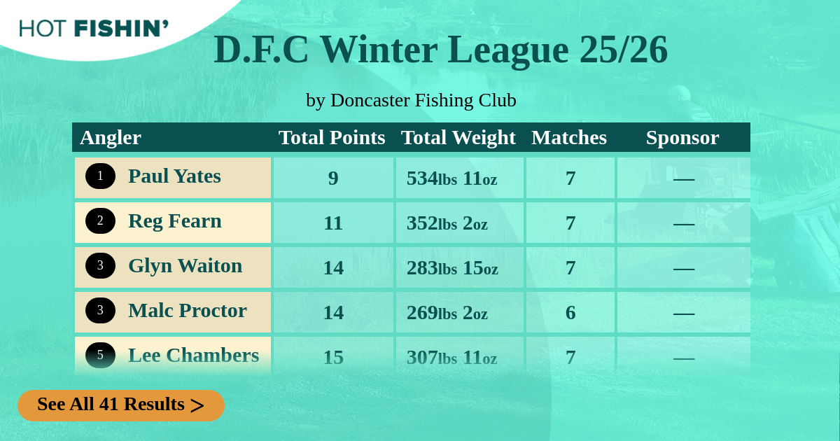 | Angler | Total Points | Total Weight | Matches | 12/10/2025 | 26/10/2025 | 09/11/2025 | 16/11/2025 | 23/11/2025 | 07/12/2025 | 14/12/2025 | Sponsor |