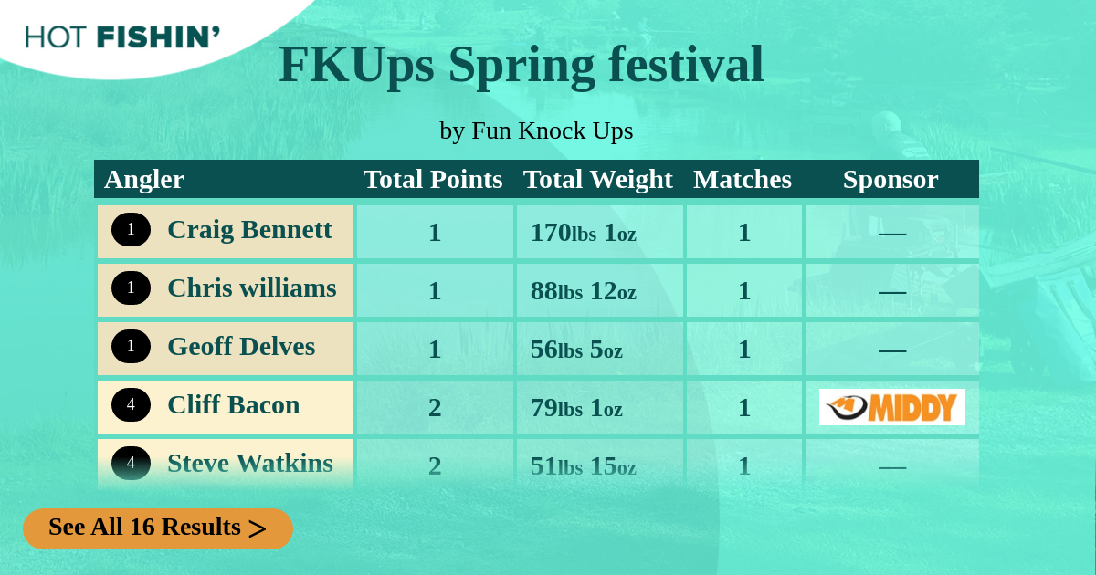 | Angler | Total Points | Total Weight | Matches | 08/04/2026 | Sponsor |
