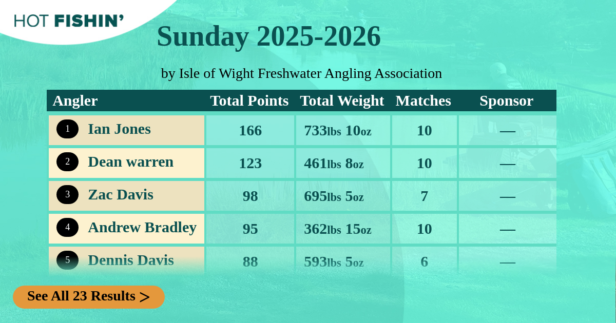 Check your performance in this 'Just For Fun' season of the tournament. Your best 10 results over the 13-week season will be used to determine the UK's top anglers!