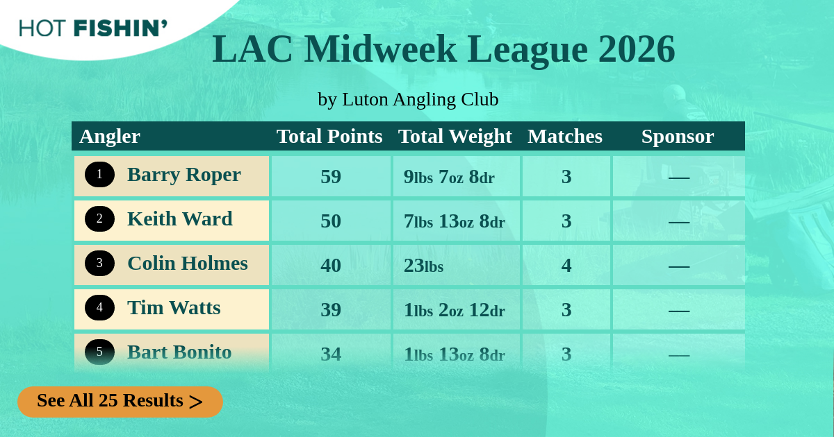 Check your performance in this 'Just For Fun' season of the tournament. Your best 10 results over the 13-week season will be used to determine the UK's top anglers!