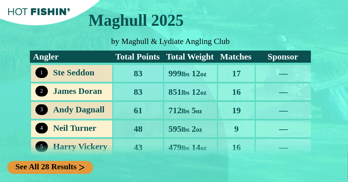 | Angler | Total Points | Total Weight | Matches | 22/02/2025 | 09/03/2025 | 23/03/2025 | 06/04/2025 | 13/04/2025 | 27/04/2025 | 11/05/2025 | 25/05/2025 | 31/05/2025 | 22/06/2025 | 06/07/2025 | 20/07/2025 | 03/08/2025 | 17/08/2025 | 31/08/2025 | 14/09/2025 | 20/09/2025 | 05/10/2025 | 19/10/2025 | 01/11/2025 | Sponsor |
