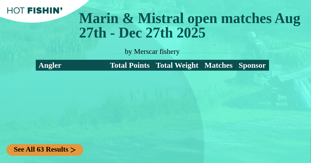 Hot Fishin' Points is a competition where the results of any match you fish receives points depending on where you rank. Prizes are won for the most points accumulated, from your best 10 matches, over the 13-week season.