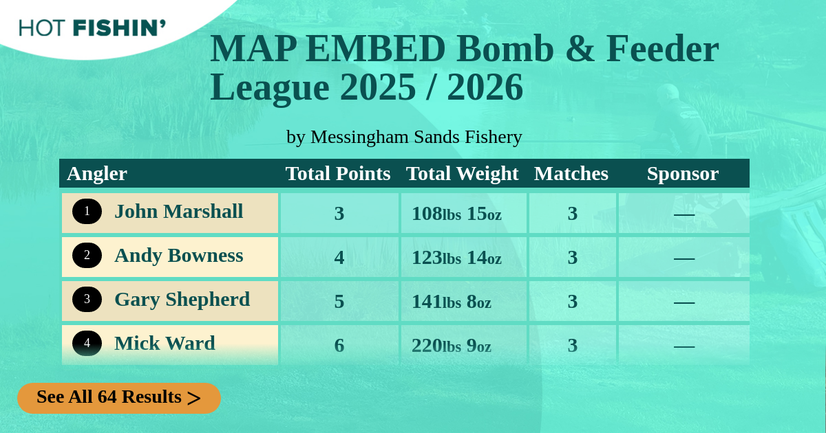 | Angler | Total Points | Total Weight | Matches | 05/11/2025 | 19/11/2025 | 03/12/2025 | Sponsor |