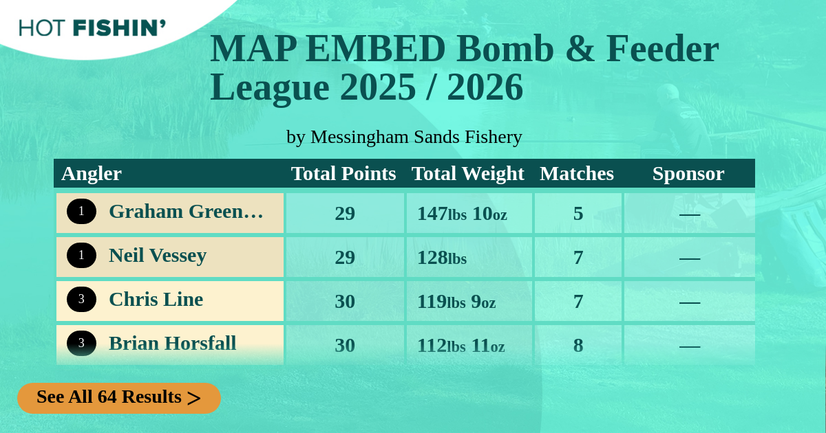 Hot Fishin' Points is a competition where the results of any match you fish receives points depending on where you rank. Prizes are won for the most points accumulated, from your best 10 matches, over the 13-week season.