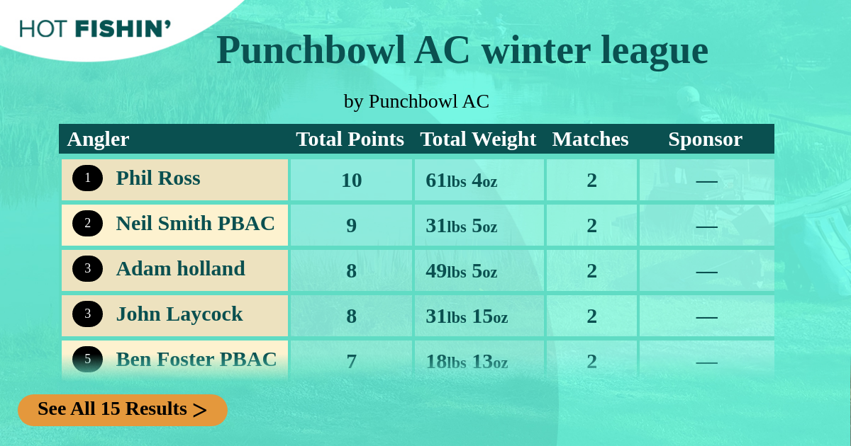 Hot Fishin' Points is a competition where the results of any match you fish receives points depending on where you rank. Prizes are won for the most points accumulated, from your best 10 matches, over the 13-week season.