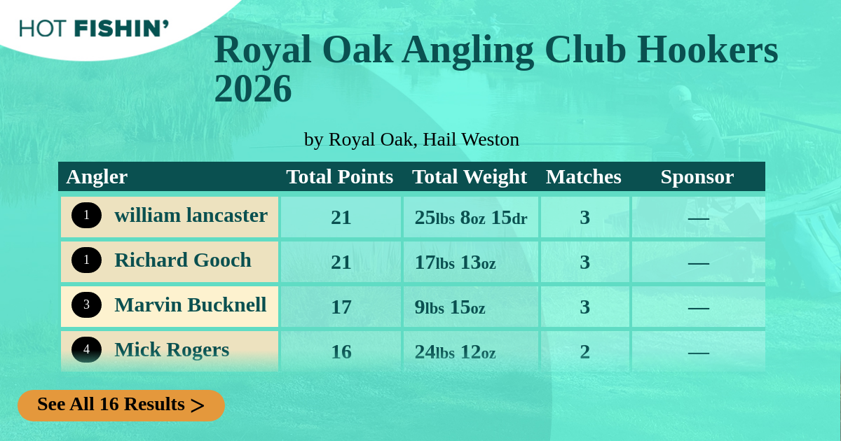 | Angler | Total Points | Total Weight | Matches | 26/01/2026 | 15/02/2026 | 01/03/2026 | Sponsor |