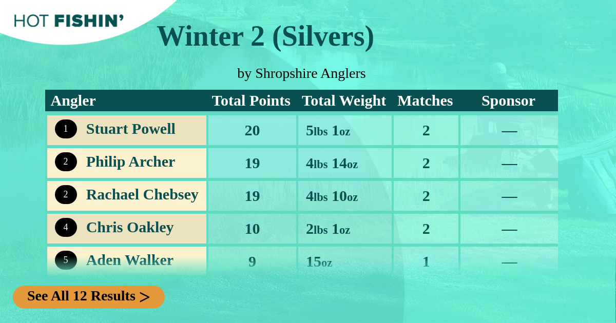 Hot Fishin' Points is a competition where the results of any match you fish receives points depending on where you rank. Prizes are won for the most points accumulated, from your best 10 matches, over the 13-week season.