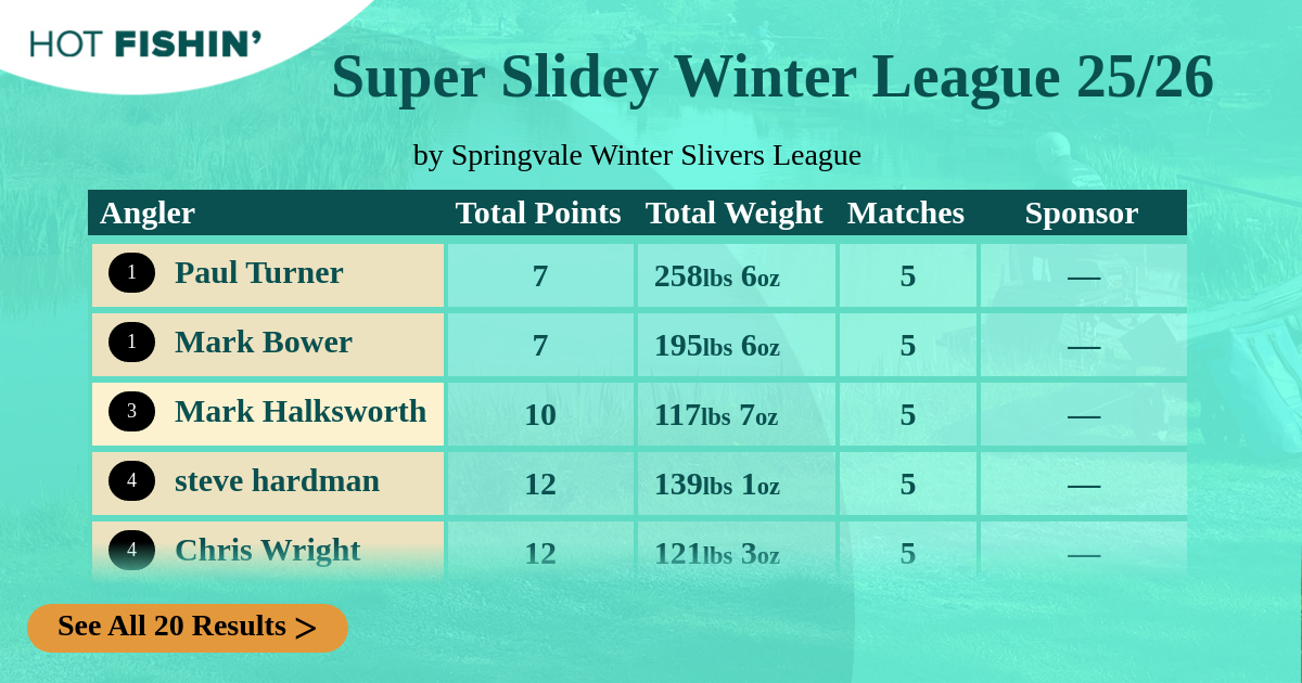 | Angler | Total Points | Total Weight | Matches | 25/10/2025 | 01/11/2025 | 15/11/2025 | 29/11/2025 | 13/12/2025 | Sponsor |