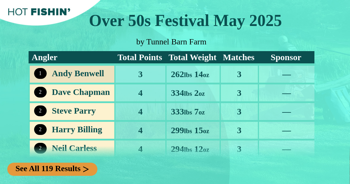 | Angler | Total Points | Total Weight | Matches | 19/05/2025 | 20/05/2025 | 21/05/2025 | Sponsor |