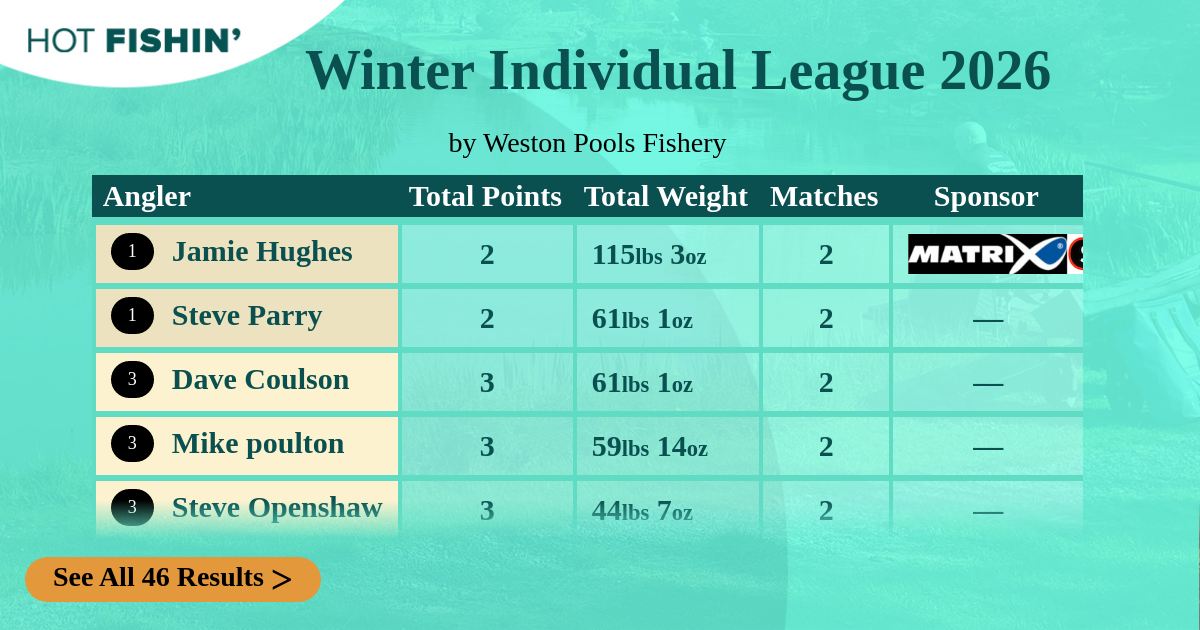 | Angler | Total Points | Total Weight | Matches | 04/01/2026 | 18/01/2026 | Sponsor |