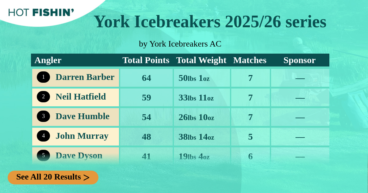 | Angler | Total Points | Total Weight | Matches | 25/01/2026 | 08/02/2026 | 15/02/2026 | 22/02/2026 | 01/03/2026 | 08/03/2026 | 15/03/2026 | Sponsor |