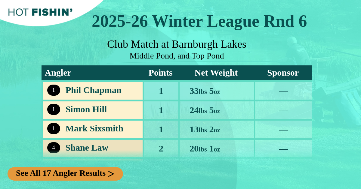 Hot Fishin' Points is a competition where the results of any match you fish receives points depending on where you rank. Prizes are won for the most points accumulated, from your best 10 matches, over the 13-week season.