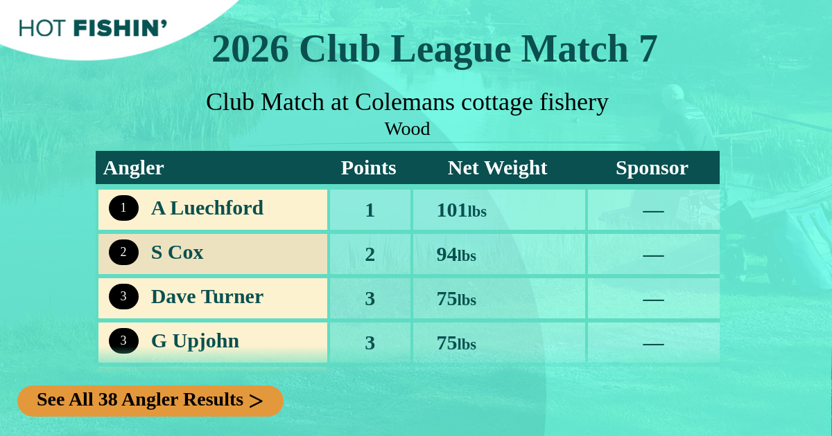 Hot Fishin' Points is a competition where the results of any match you fish receives points depending on where you rank. Prizes are won for the most points accumulated, from your best 10 matches, over the 13-week season.