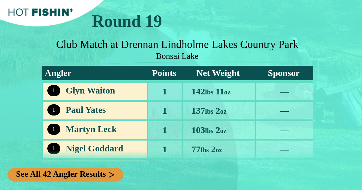 | Angler | Points | Net Weight | Section | Peg | Attendance | Sponsor |