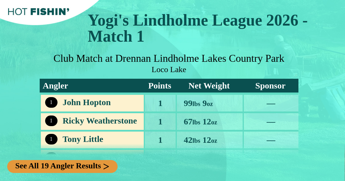18 Andrew Rawson TwinnyEZWBG | 6 | 9.214kg20lbs 5oz | B | 22 | Full Day | — |