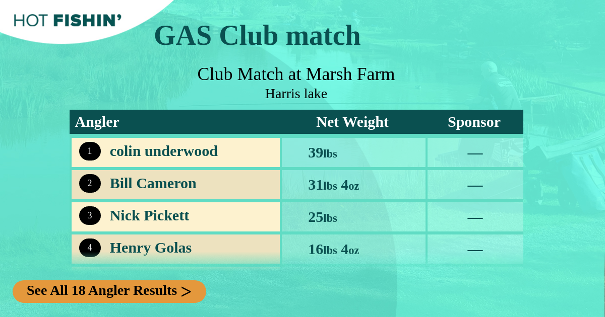 | Angler | Net Weight | Section | Peg | Notes | Sponsor | |