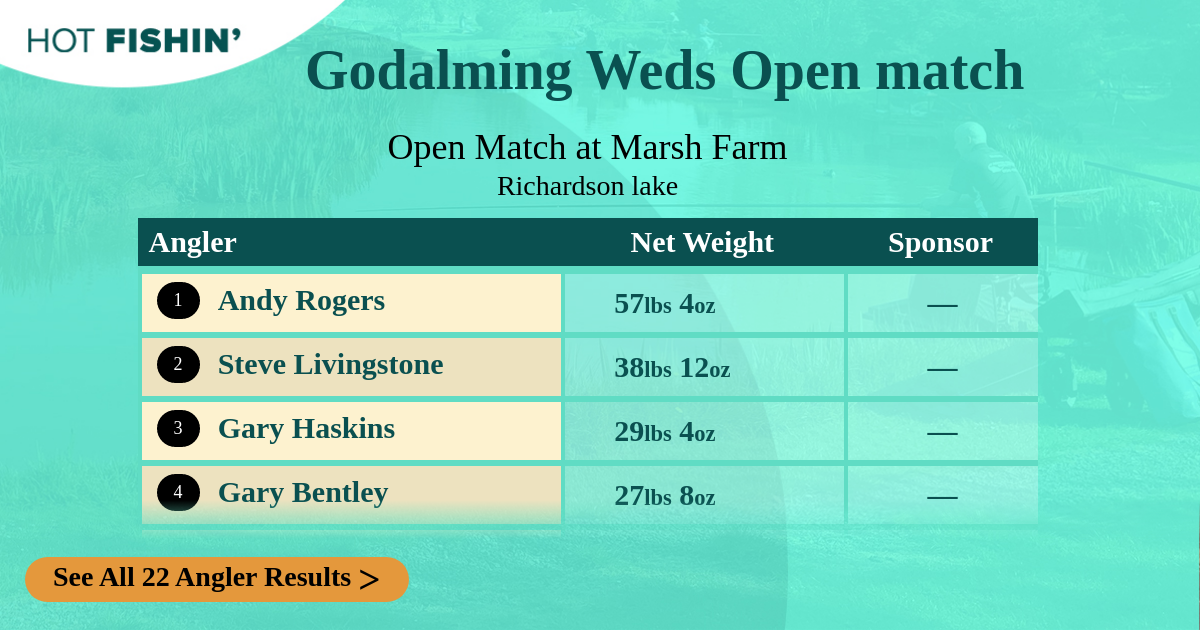 | Angler | Net Weight | Section | Peg | Notes | Sponsor | |