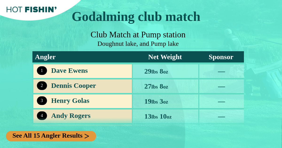 | Pump lake | Net Weight | Section | Peg | Notes | Sponsor | |