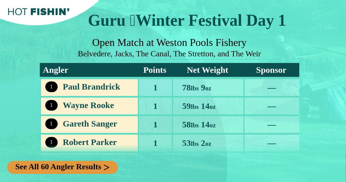 1 Wayne RookeUP63J | 1 | 27.159kg59lbs 14oz | The Weir | B | 17 | Full Day | — |