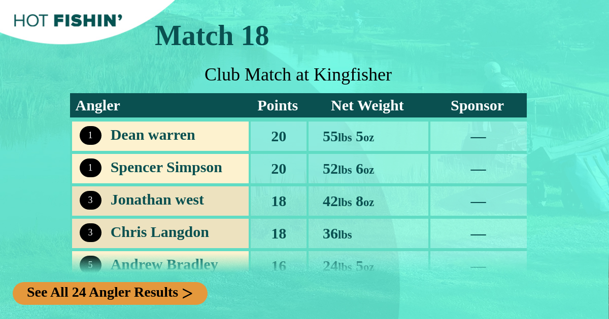 Hot Fishin' Points  is a competition where the results of any match you fish receives points depending on where you rank. Prizes are won for the most points accumulated, from your best 10 matches, over the 13-week season.