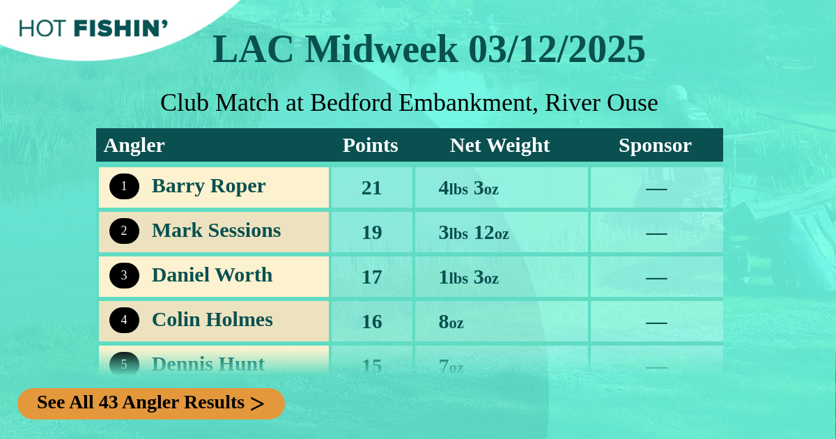 | Bedford Embankment, River Ouse | Points | Net Weight | Peg | Attendance | Sponsor |
