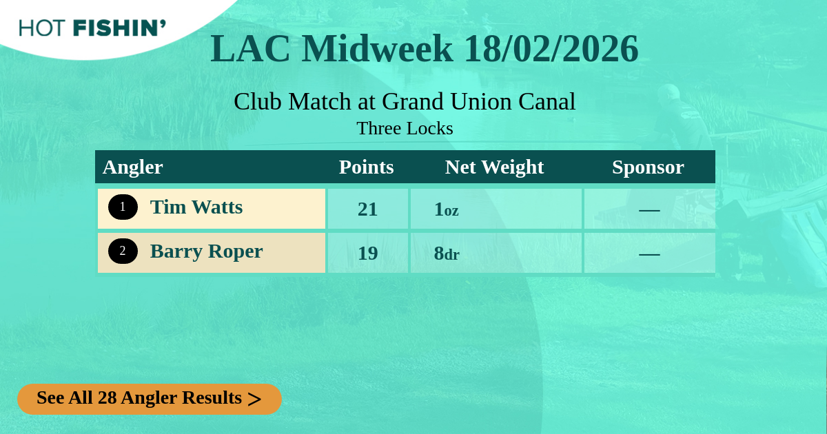 Hot Fishin' Points is a competition where the results of any match you fish receives points depending on where you rank. Prizes are won for the most points accumulated, from your best 10 matches, over the 13-week season.