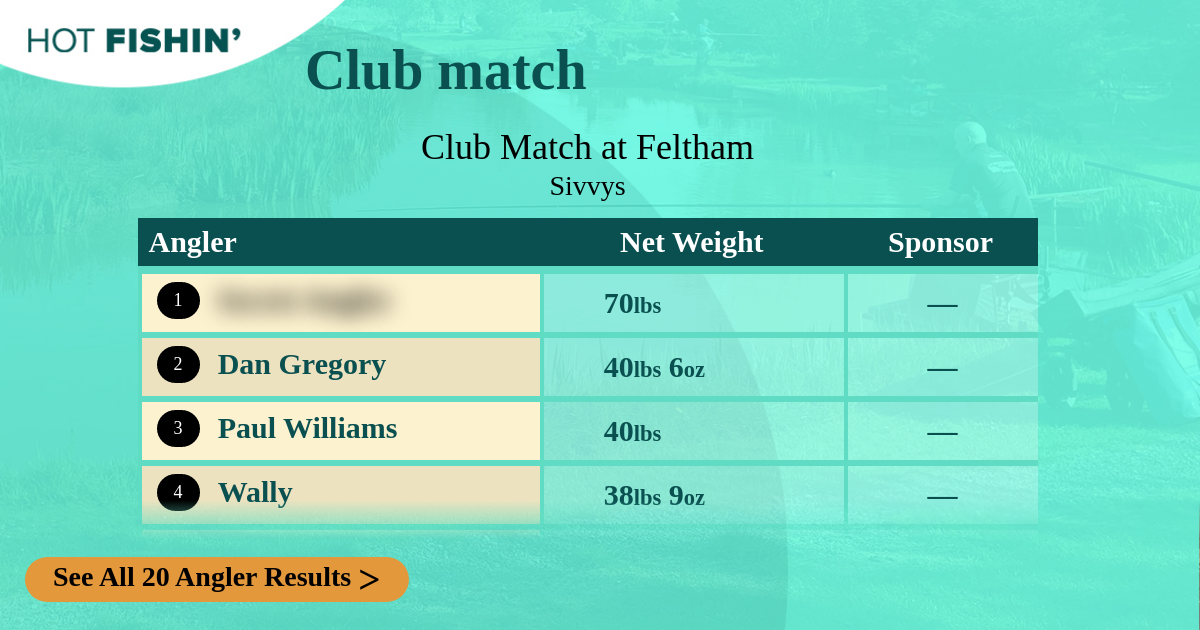 | Angler | Net Weight | Section | Peg | Sponsor | |