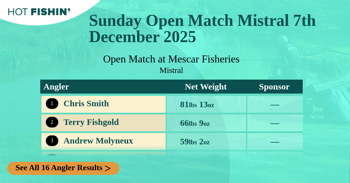 Hot Fishin' Points is a competition where the results of any match you fish receives points depending on where you rank. Prizes are won for the most points accumulated, from your best 10 matches, over the 13-week season.
