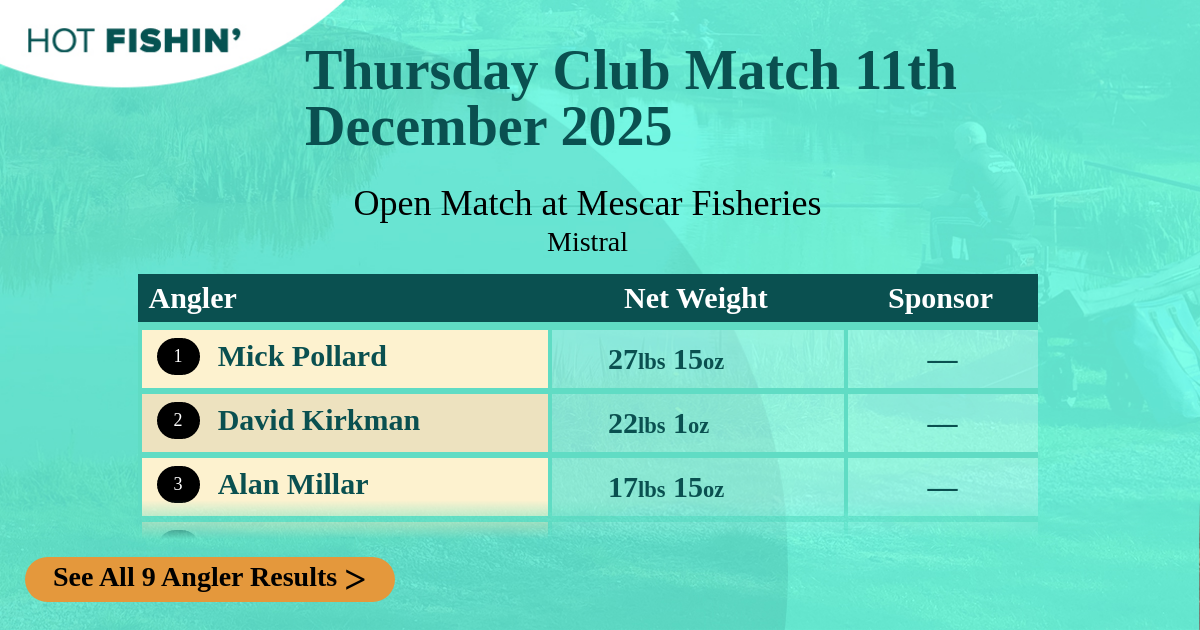 3 Alan MillarLO8QW | 8.136kg17lbs 15oz | B | 50 | Full Day | — |
