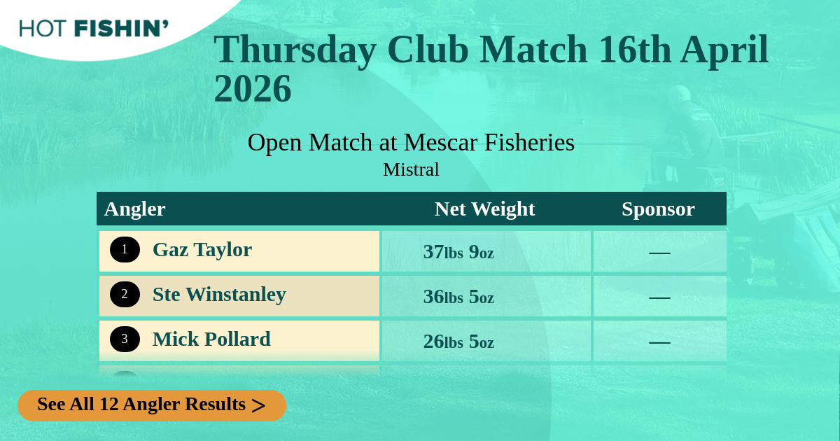 | Angler | Net Weight | Section | Peg | Attendance | Sponsor |