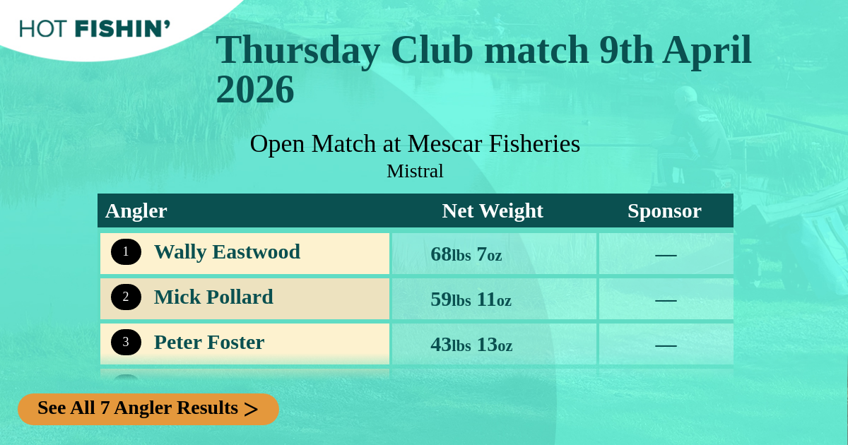Hot Fishin' Points is a competition where the results of any match you fish receives points depending on where you rank. Prizes are won for the most points accumulated, from your best 10 matches, over the 13-week season.