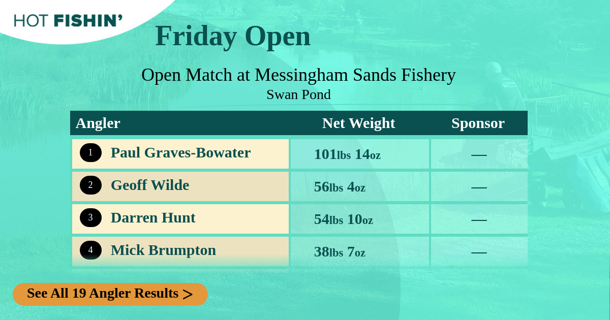 Hot Fishin' Points is a competition where the results of any match you fish receives points depending on where you rank. Prizes are won for the most points accumulated, from your best 10 matches, over the 13-week season.