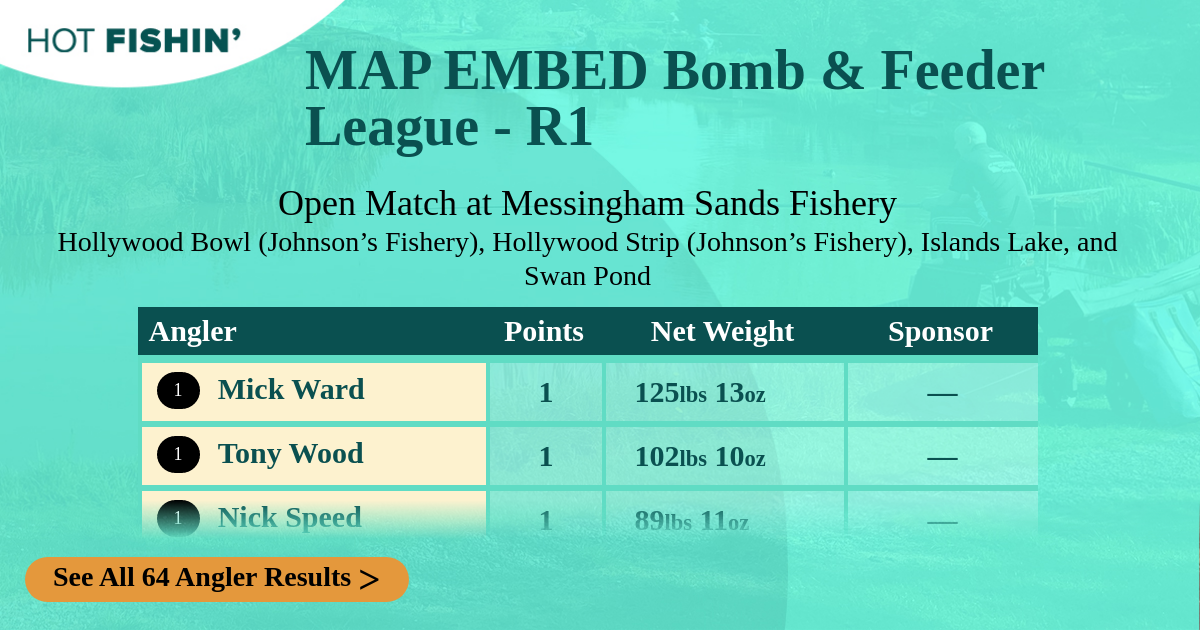 2 Tony WoodZ969P | 1 | 46.55kg102lbs 10oz | Hollywood Bowl (Johnson’s Fishery) | G | 31 | Full Day | — |