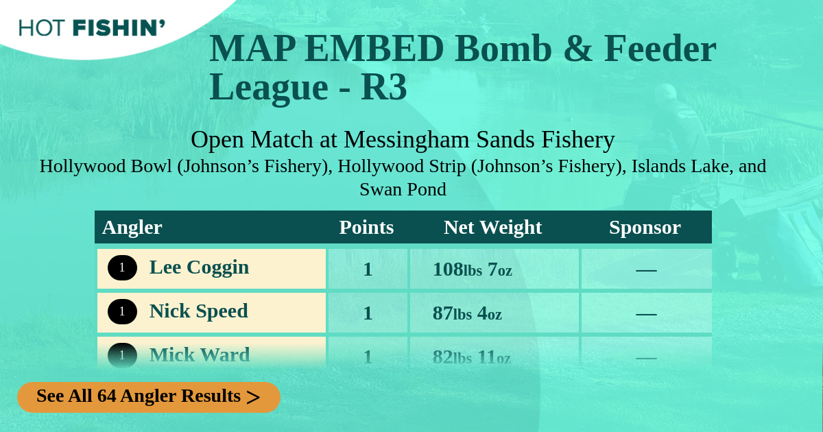 3 Paul WrightHIY3F | 3 | 25.713kg56lbs 11oz | Hollywood Bowl (Johnson’s Fishery) | 49 | Full Day | — |