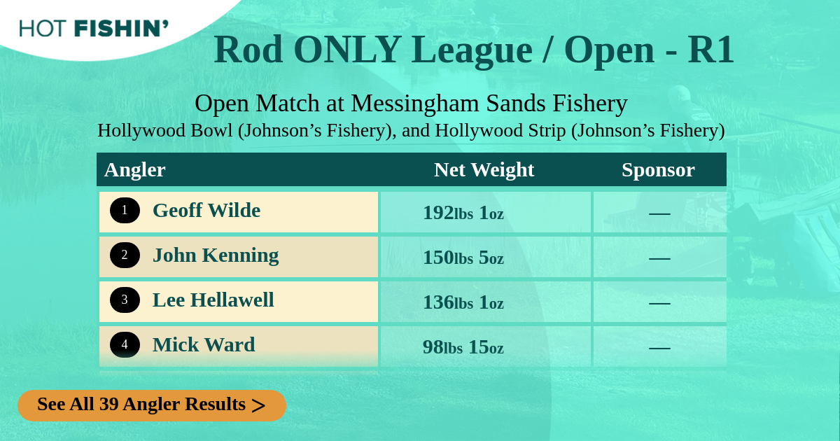 1 Geoff Wilde5HDRB | 87.118kg192lbs 1oz | Hollywood Bowl (Johnson’s Fishery) | 48 | — | |