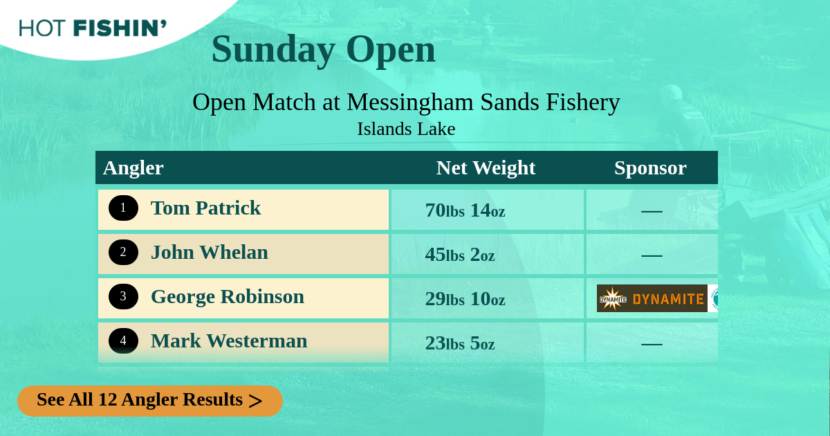 Hot Fishin' Points is a competition where the results of any match you fish receives points depending on where you rank. Prizes are won for the most points accumulated, from your best 10 matches, over the 13-week season.