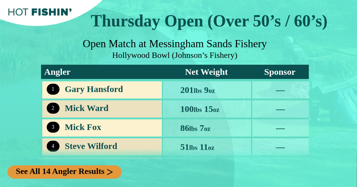 | Angler | Net Weight | Section | Peg | Sponsor | |