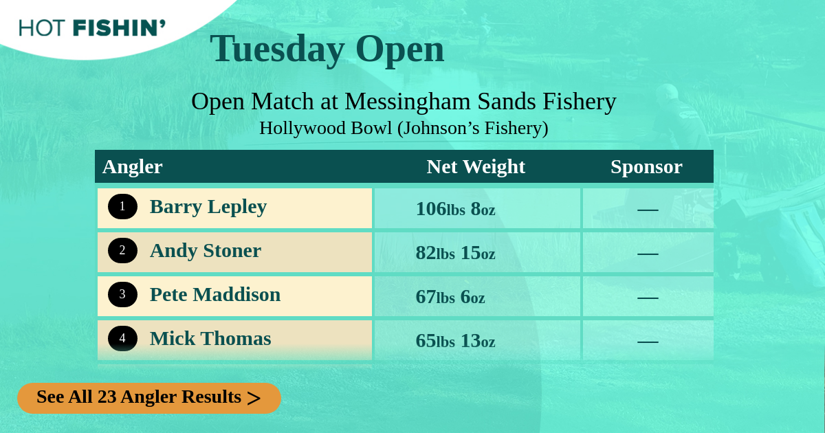Open match anglers are ranked by the best average weight per hour and the top 3 positions win a percentage of the total entry prize pot. The remaining pot is distributed to the rest of the contestants in equal prizes each week.
