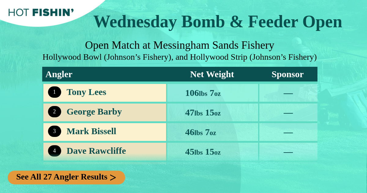| Hollywood Bowl (Johnson’s Fishery) | Net Weight | Section | Peg | Sponsor | |