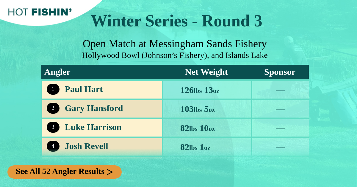 1 Paul Hart1FR9T | 57.521kg126lbs 13oz | Hollywood Bowl (Johnson’s Fishery) | 48 | — | |