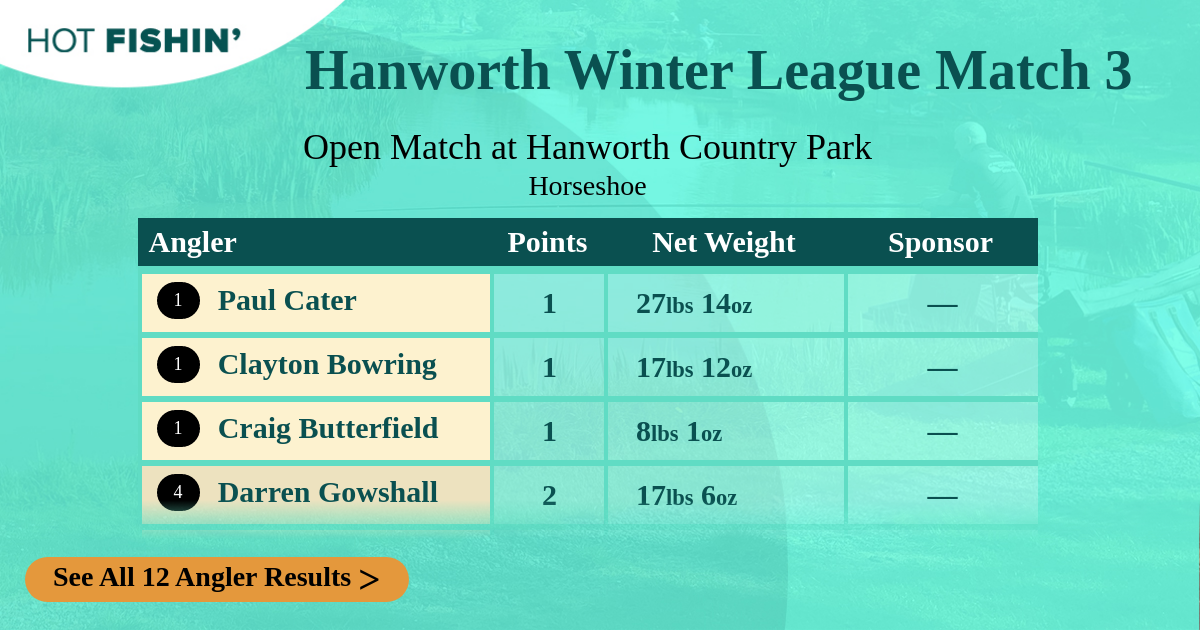 1 Paul CaterAMX4K | 12.644kg27lbs 14oz | C | 25 | Full Day | — |