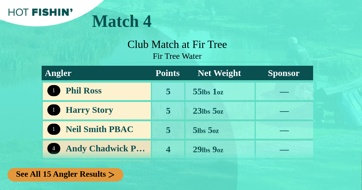 | Angler | Points | Net Weight | Section | Peg | Attendance | Sponsor |