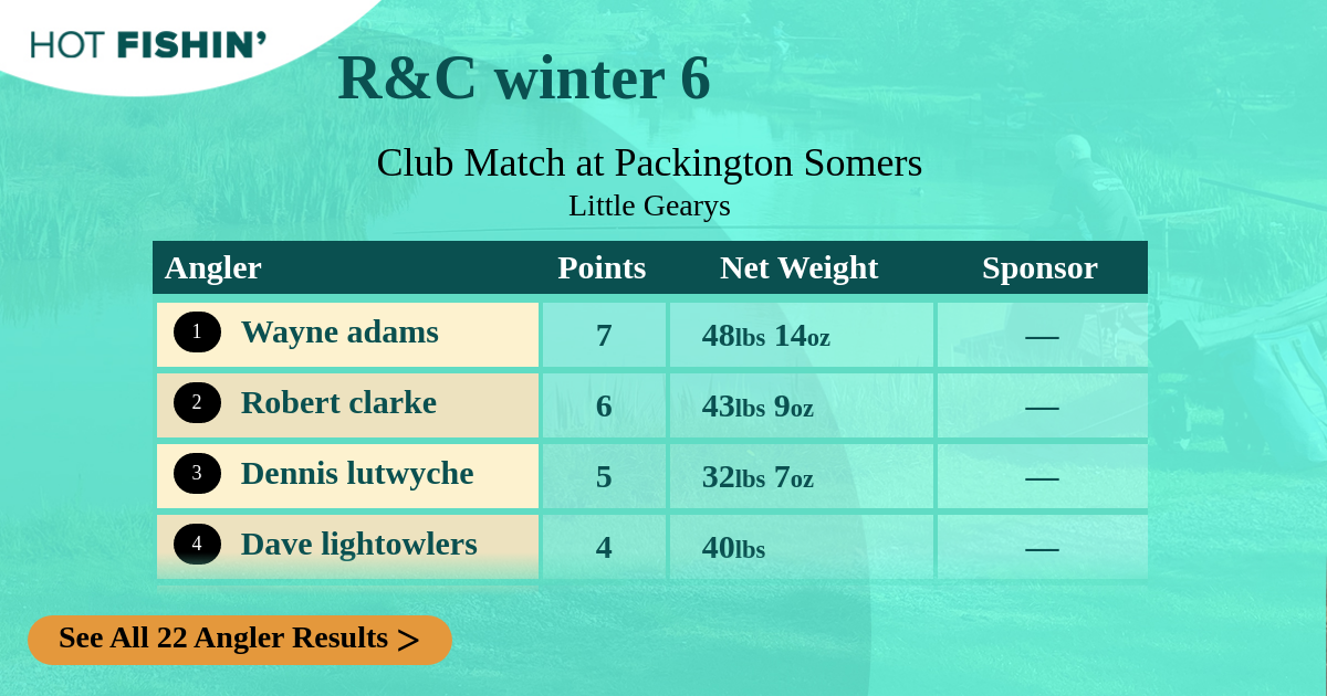 5 Robert SherringhamYIGIM | 1 | 6.038kg13lbs 5oz | 29 | Full Day | — |